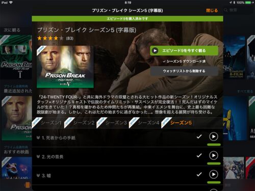 iPadのAmazonプライムビデオのアプリを起動したら、最近追加されたTV番組のはじめにプリズン・ブレイクシーズン5がリストされてて、あれ?って思ってタップしてみたら、 プリズンブレイクのシーズン5の吹き替え版が表示されました。 とすると、字幕版もそう…