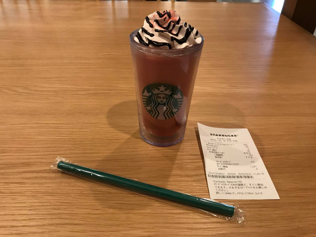 毎回ホワイトモカシロップ(50円)追加して、上にチョコソースをかけてカップ値引き20円で税込み712円。