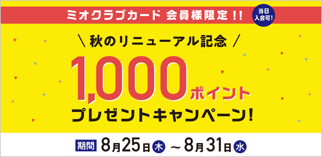 8/25(木)~8/31(水)の期間中に10,000円(税込、期間中合算可)以上お買い上げいただいたミオクラブ会員様にミオクラブ1,000ポイントをもれなくプレゼント!