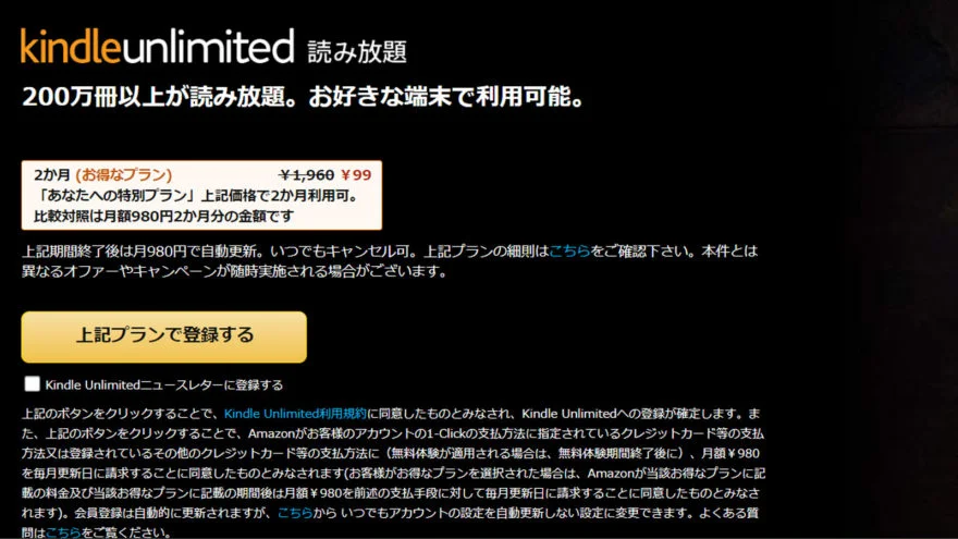 しかし、このセット買いの場合はKindle Unlimited付きは選べないんですよね。その代わり、2か月お試し99円なプロモーションが私の目の前に飛び込んできました。