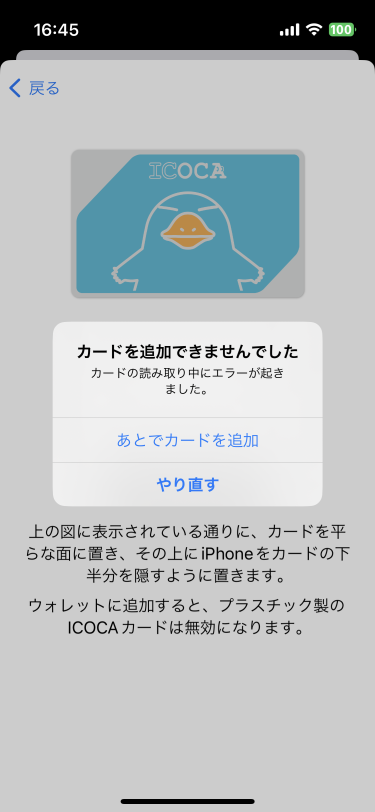 その後、利用規約に同意する画面が表示してあたふたしているうちに、すぐに読み取り始めてしまうんですね。「やり直す」をタップして再試行。