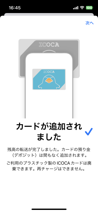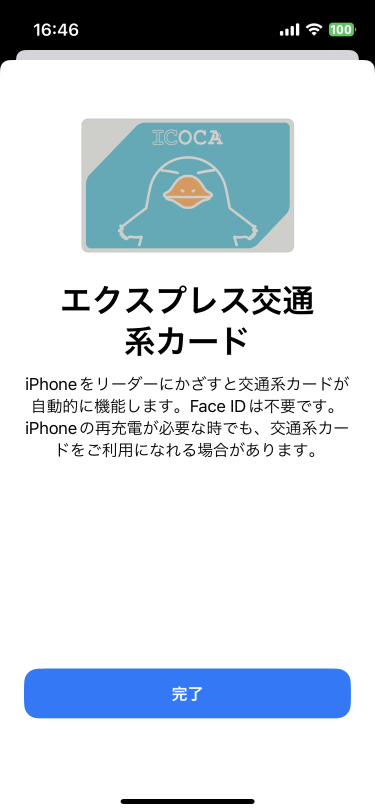 エクスプレス交通系カードになりまっせーという説明が表示されたら[完了]ボタンをタップ。