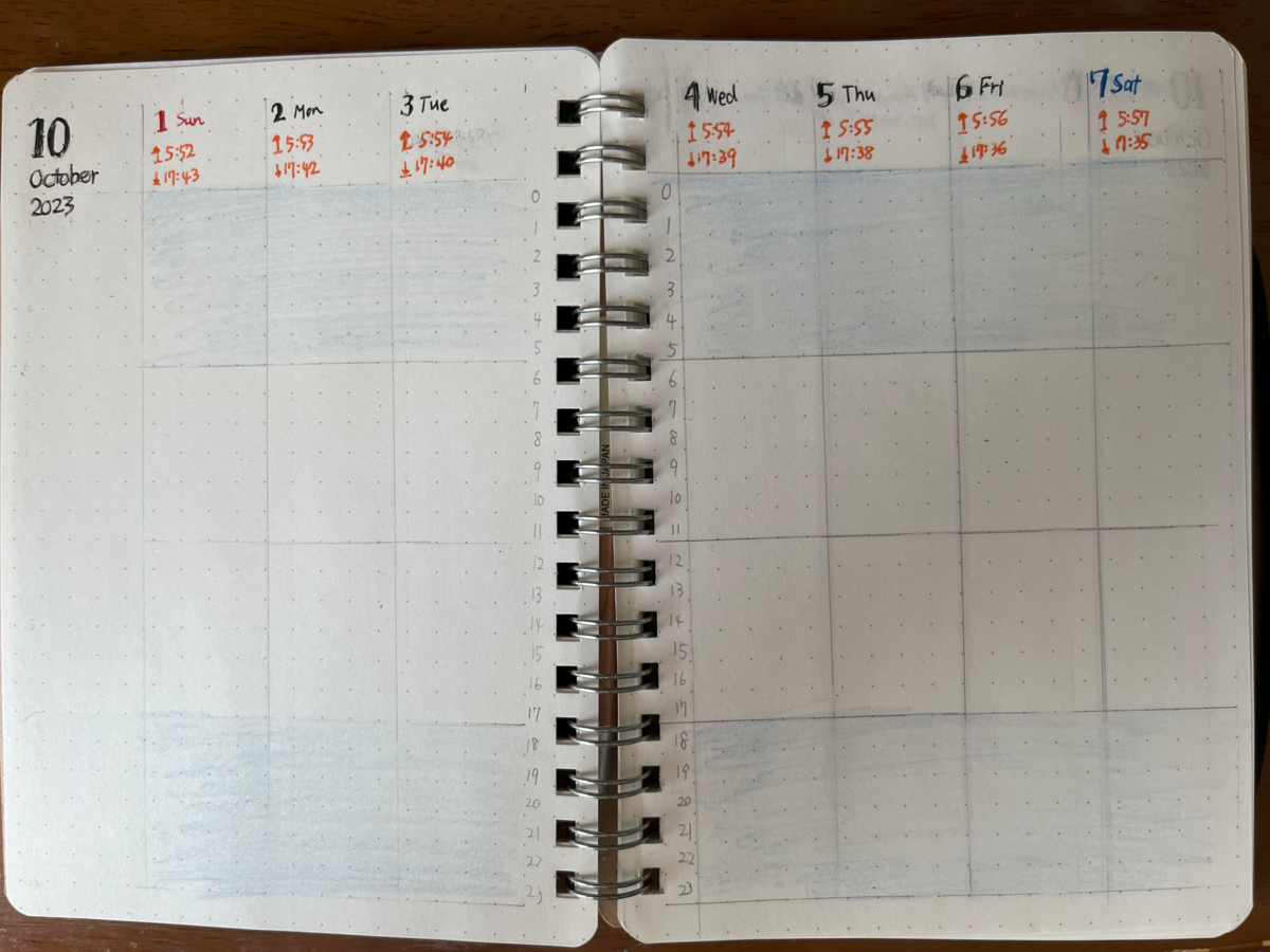来月は日曜日から始まるので、こんな感じに。日の長さを感じる手帳っぽく、青鉛筆で薄く塗りつぶし。
