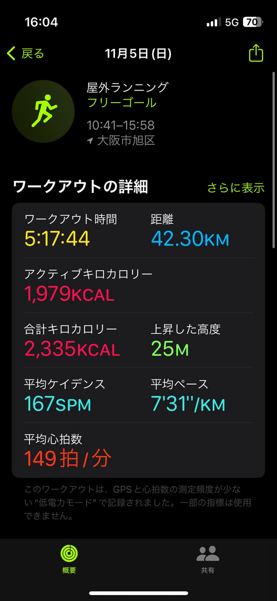 一方、Apple Watchの低電力モードで、GPSと心拍数の計測を抑えたモードにしたんですが、別に低電力モードだけでイケたんじゃね?って。