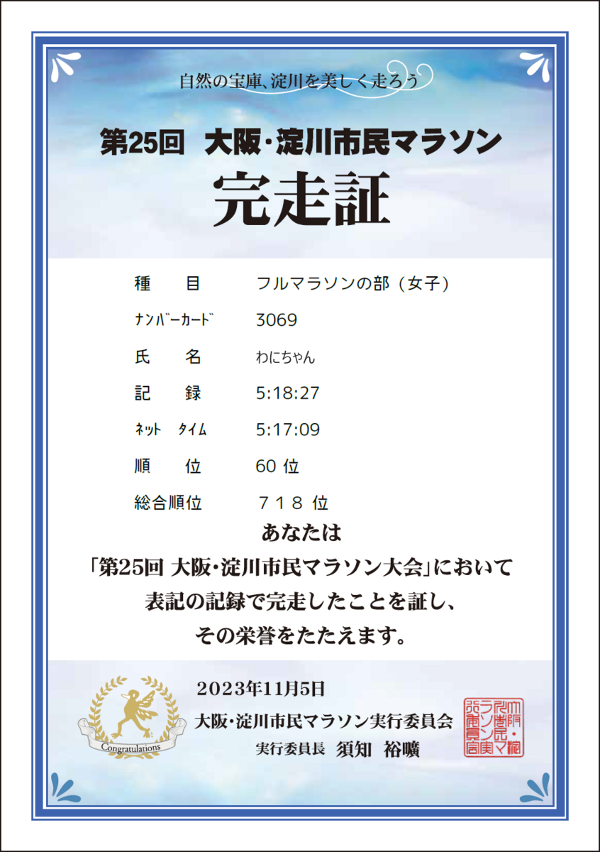 で、完走証によるとこんな感じ(氏名をニックネームに加工)。